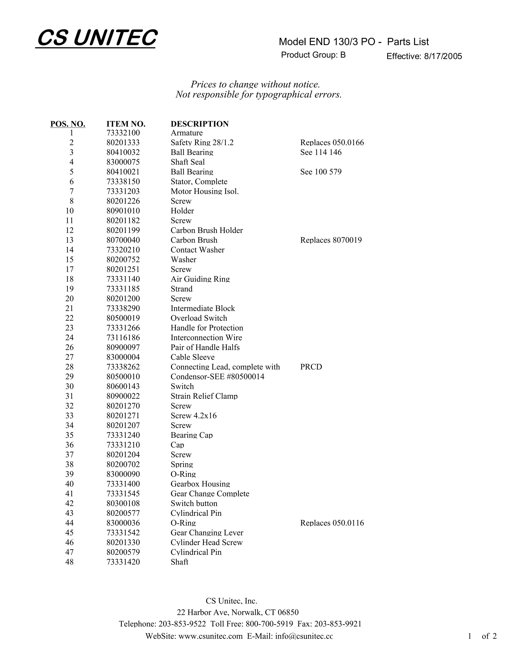 This document is a parts list for a CS UNITEC Model END 130/3 PO core drill. It contains 85 numbered parts with descriptions and part numbers. The parts list includes items such as the armature, safety ring, ball bearings, motor housing isolator, carbon brushes, screws, overload switch, gearbox housing, gears, seals, and a water valve. It provides replacement part numbers for some items and refers to other part numbers for additional information.