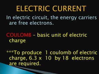In electric circuits, free electrons carry energy and charge. A coulomb is the unit of electric charge, which is equal to the charge carried by 6.3 x 10^18 electrons. Batteries produce direct current, where the charges at the terminals remain constant over time. Alternating current involves a continuous back-and-forth movement of electrons provided by power companies through household circuits.