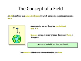 1. A field is defined as a property of space in which a material object experiences a force. For example, above the earth there is a gravitational field where a mass experiences a downward force.