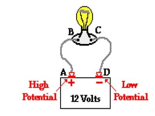 The document discusses electric fields and circuits. It defines the electric field as the force on a small charge divided by the charge. It describes field lines representing electric fields and their properties. It also defines electric potential, current, resistance, power, and Ohm's law, describing the relationships between these concepts in electric circuits.
