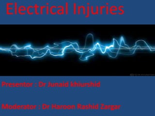 The document discusses electric injuries, detailing their definitions, pathophysiology, epidemiology, injury mechanisms, and treatment protocols. It highlights the significance of understanding the effects of both low and high voltage electric injuries, including the risks of cardiac, respiratory, neurological, and dermatological complications. Management strategies emphasize careful assessment, red flag identification, and prevention measures, especially targeting vulnerable populations like children.