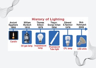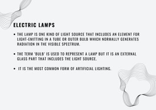The document discusses different types of electric lamps used for artificial lighting. It describes lamps such as incandescent, fluorescent, mercury vapor, metal halide, and high/low pressure sodium vapor lamps. Each type of lamp uses a different light-generating process and has varying efficiencies. The most efficient modern lamp is the LED, which produces light via semiconductors and can achieve up to 90% efficiency compared to incandescent bulbs.