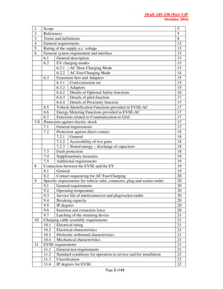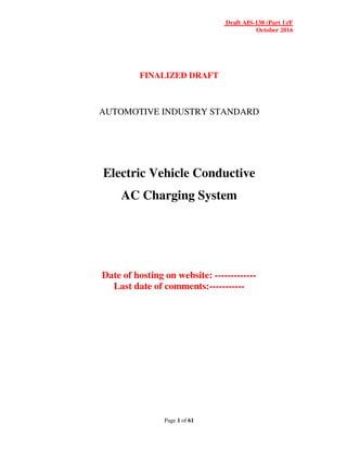 The document outlines the Automotive Industry Standard (AIS-138 Part 1) for electric vehicle conductive AC charging systems, including specifications for performance and safety applicable to electric and hybrid vehicles in India. It details requirements for the charging equipment, electric shock protection, vehicle connections, and environmental considerations, referencing relevant international standards. The establishment of this standard is part of India's initiative to enhance the infrastructure for electric vehicles under the National Electric Mobility Mission Plan.
