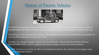 The document provides an overview of electric vehicles (EVs), detailing their history, operation, types, and advantages and disadvantages. It highlights the transition from initial electric vehicles in the 1800s to modern advancements, particularly in India with initiatives like the National Electric Mobility Mission Plan (NEMMP) 2020. Key features of EVs such as regenerative braking, charging methods, and their environmental benefits compared to conventional vehicles are also discussed.