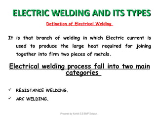 This document discusses two main types of electrical welding: resistance welding and arc welding. Resistance welding uses heat generated by electrical resistance to fuse metals and includes spot welding, seam welding, and projection welding. Arc welding uses an electric arc between an electrode and the workpiece to generate temperatures over 10,000 degrees Fahrenheit and melt the metals. Different arc welding processes use direct or alternating current and different polarities to influence the heat distribution. Shielded metal arc welding is commonly used and provides versatility but with lower productivity than continuous wire processes.