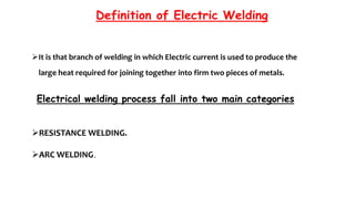 The document presents a detailed overview of electric welding, its definitions, processes, and various types including resistance and arc welding. It covers specific methods like butt welds, spot welds, and seam welds, highlighting their applications in industries such as automotive manufacturing. Additional focus is given to the electric arc and processes like carbon arc welding and atomic hydrogen welding.