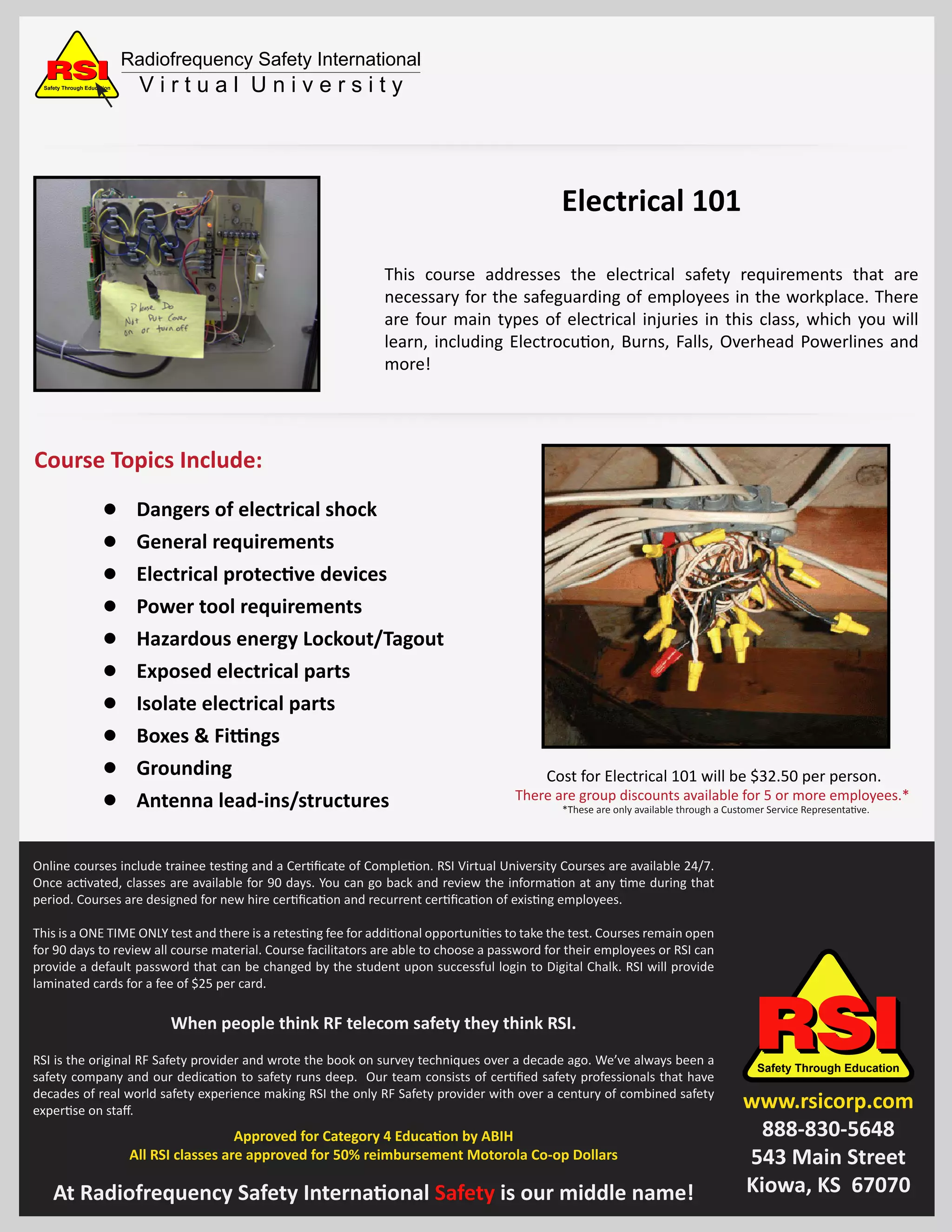 This document provides information about an online electrical safety course called "Electrical 101" offered by Radiofrequency Safety International (RSI). The course covers electrical safety requirements in the workplace, including dangers of electrical shock, protective devices, power tool requirements, and lockout/tagout procedures. It costs $32.50 per person, with group discounts available. Upon completion, students receive a certificate. The course is available online 24/7 for 90 days, with a retest fee for the exam. RSI is dedicated to RF safety education with certified instructors who have decades of experience in safety.