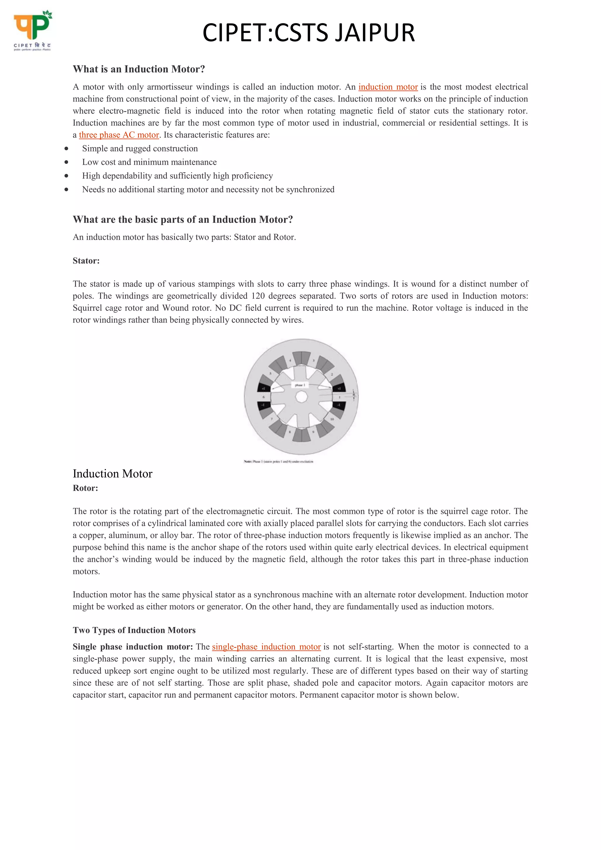 An induction motor works on the principle of electromagnetic induction where a rotating magnetic field in the stator induces current in the rotor. It has two main parts - a stationary stator wound with coils, and a rotating rotor. The most common type of rotor is the squirrel cage rotor, made of aluminum or copper bars in slots to conduct the induced current. Induction motors are widely used in industry due to their simple and rugged construction, low cost, and high reliability.