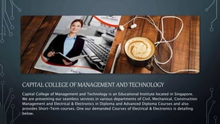 This document provides information about electrical and electronics diploma and advanced diploma programs offered by Capital College of Management and Technology in Singapore. It details the course content, duration, fees and entry requirements for the Diploma in Electrical and Electronics program which takes 6 months and the Advanced Diploma in Electrical and Electronics program which takes 12 months. Both programs aim to develop skills relevant to industries like telecommunications, IT and electronics.