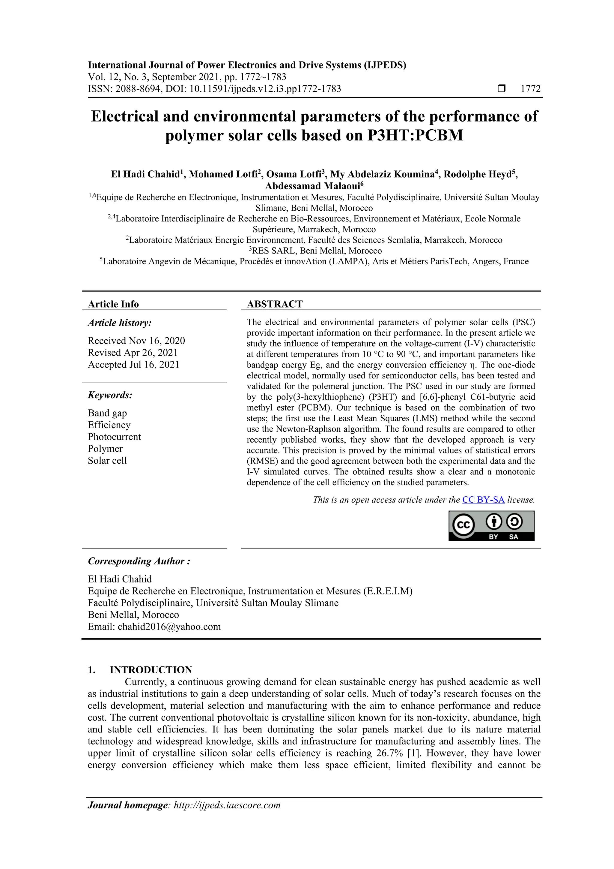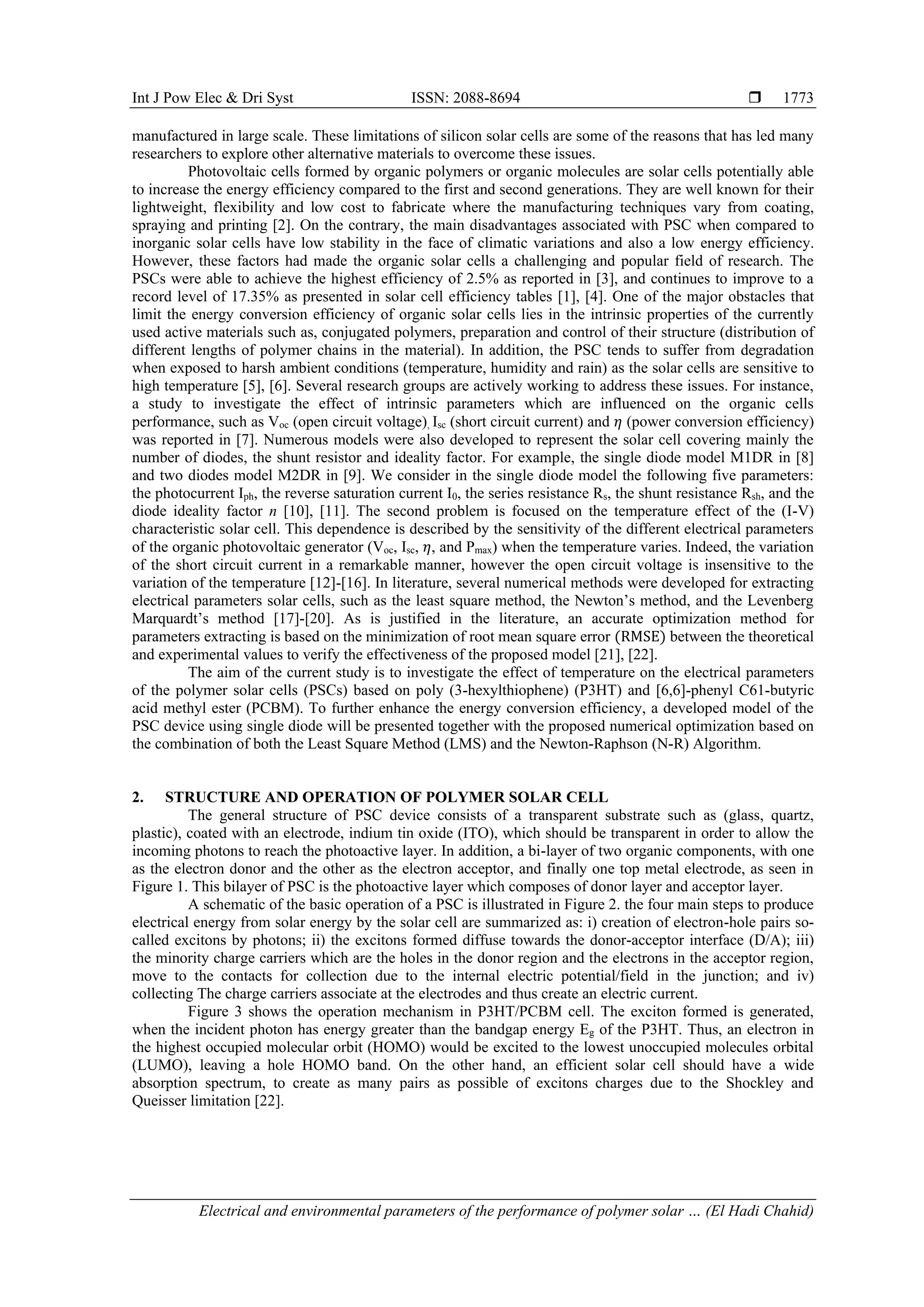 The study explores the performance of polymer solar cells (PSCs) incorporating poly(3-hexylthiophene) (P3HT) and [6,6]-phenyl C61-butyric acid methyl ester (PCBM), focusing on the influence of temperature on their electrical parameters. It validates a one-diode electrical model using a combination of least mean squares (LMS) and Newton-Raphson algorithms to accurately extract parameters like efficiency and current-voltage characteristics. Results indicate a significant dependency of cell efficiency on temperature and other studied parameters, demonstrating promising advancements in the optimization of PSC performance.
