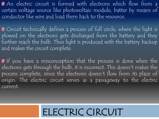 An electric circuit is formed with electrons that flow from a voltage source like a battery through a conductor like wire to a load and back to the source, completing the circuit. Key components include a power source, wires, and a load such as a light bulb. Circuits can be open or closed, with closed circuits allowing continuous current flow and open circuits interrupting flow. Circuit types include parallel, series, and series-parallel configurations.