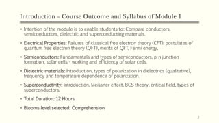This document provides an introduction and syllabus for a module on electrical properties and free electron theory. It discusses key concepts from classical and quantum free electron theory, including postulates, failures of the classical theory, the importance of Fermi energy, and advantages of the quantum theory. Example questions are also provided to test comprehension of topics like thermal velocity, root mean square velocity, and the effects of temperature on conductivity.