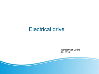 This document discusses electrical drives. It defines an electrical drive as a system that uses an electric motor to control motion for various industrial processes. The key components of an electrical drive system are a power source, power modulator, controller, motor, sensing unit, and mechanical load. The power source provides energy, typically from a 3-phase AC supply. The power modulator interfaces the motor to the power source and provides adjustable voltage, current and frequency. Common types of power modulators include controlled rectifiers, inverters, AC voltage regulators, DC choppers, and cycloconverters. Electrical drives offer advantages like flexible control, easy starting and braking, wide speed and torque ranges, and no exhaust emissions.