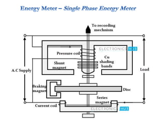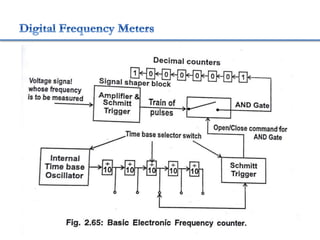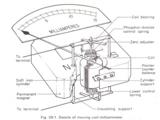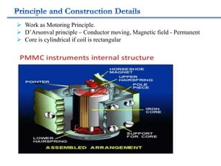 1. The document discusses various types of instruments used for measurement of electrical quantities like current, voltage, power, energy, frequency, phase etc. It describes different working principles like magnetic, thermal, electrostatic etc.