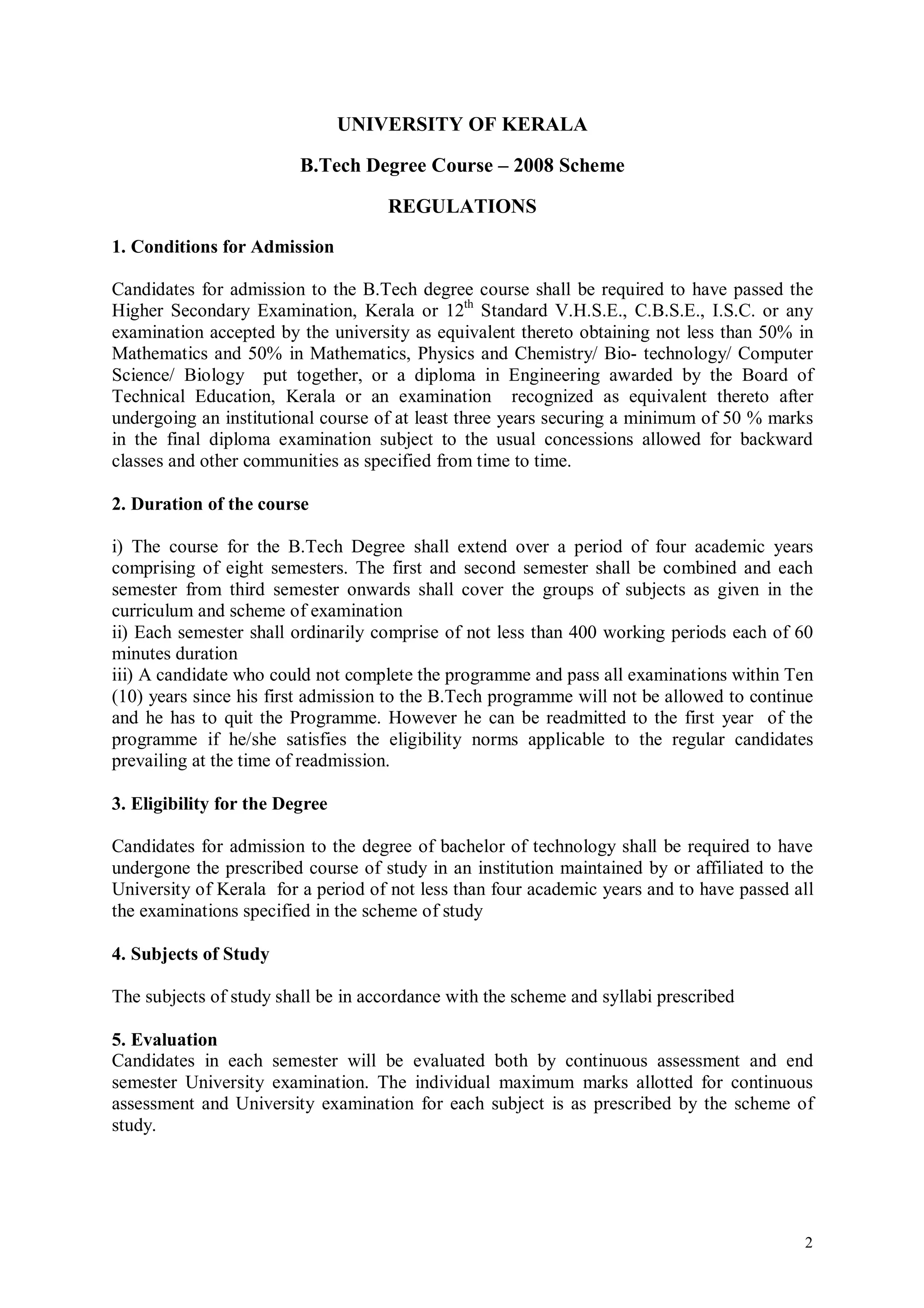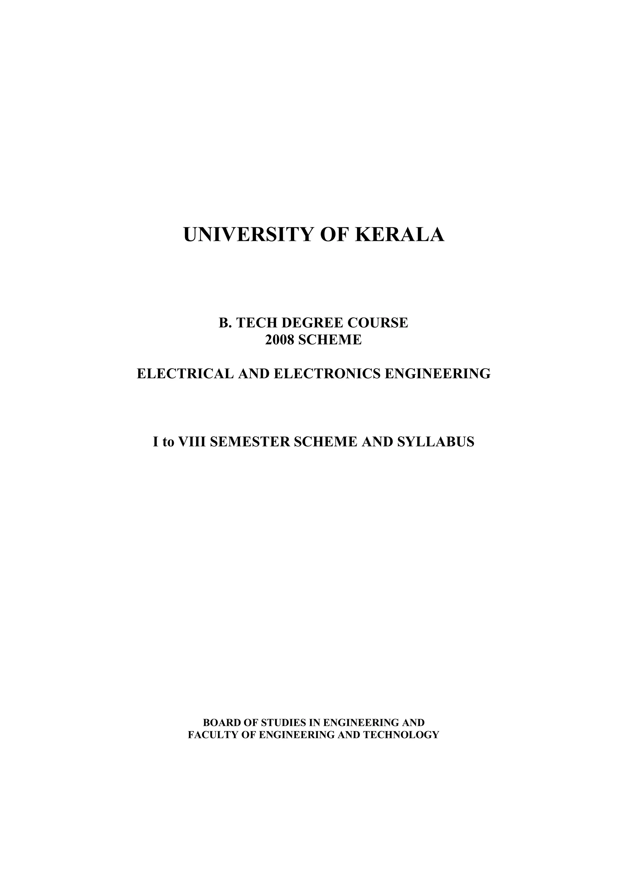 The document outlines the scheme and syllabus for the Bachelor of Technology (B.Tech) degree course in Electrical and Electronics Engineering at the University of Kerala for 2008. It details the regulations for admission, duration of the course, eligibility criteria, subjects of study, evaluation process, grading system, minimum requirements to pass, and classification of successful candidates. The course is spread over 8 semesters with the first two semesters combined. The document provides the semester-wise breakup of subjects, credits, workload, and examination scheme.