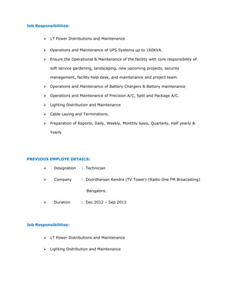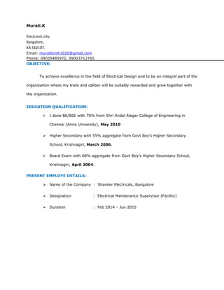 This document contains the resume of Murali.K summarizing his objective, education, work experience and strengths. Murali seeks to excel in electrical design and grow with an organization. He has a BE in electrical engineering with 70% and work experience as an electrical maintenance supervisor and technician. His strengths include handling responsibility, teamwork, learning new technologies quickly and good communication skills.