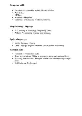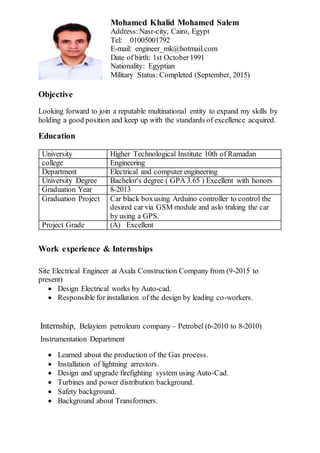 Mohamed Khalid Mohamed Salem is seeking a position as an electrical engineer to expand his skills. He has a Bachelor's degree in Electrical and Computer Engineering from the University Higher Technological Institute 10th of Ramadan with a GPA of 3.65. His work experience includes being a Site Electrical Engineer at Asala Construction Company since 2015 where he designs electrical works using AutoCAD and oversees installations. He also completed an internship at Belayiem Petroleum Company in 2010 where he learned about gas production processes and installed lightning arrestors and firefighting systems using AutoCAD.