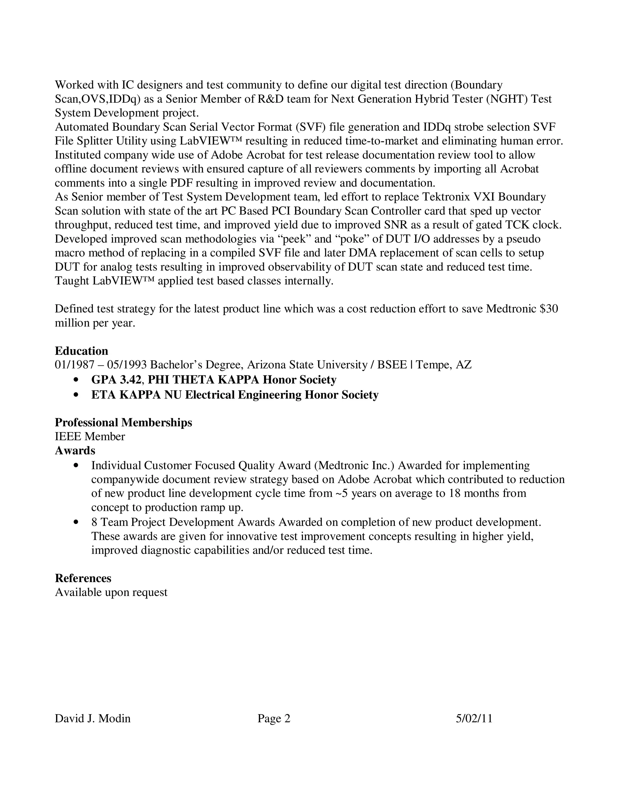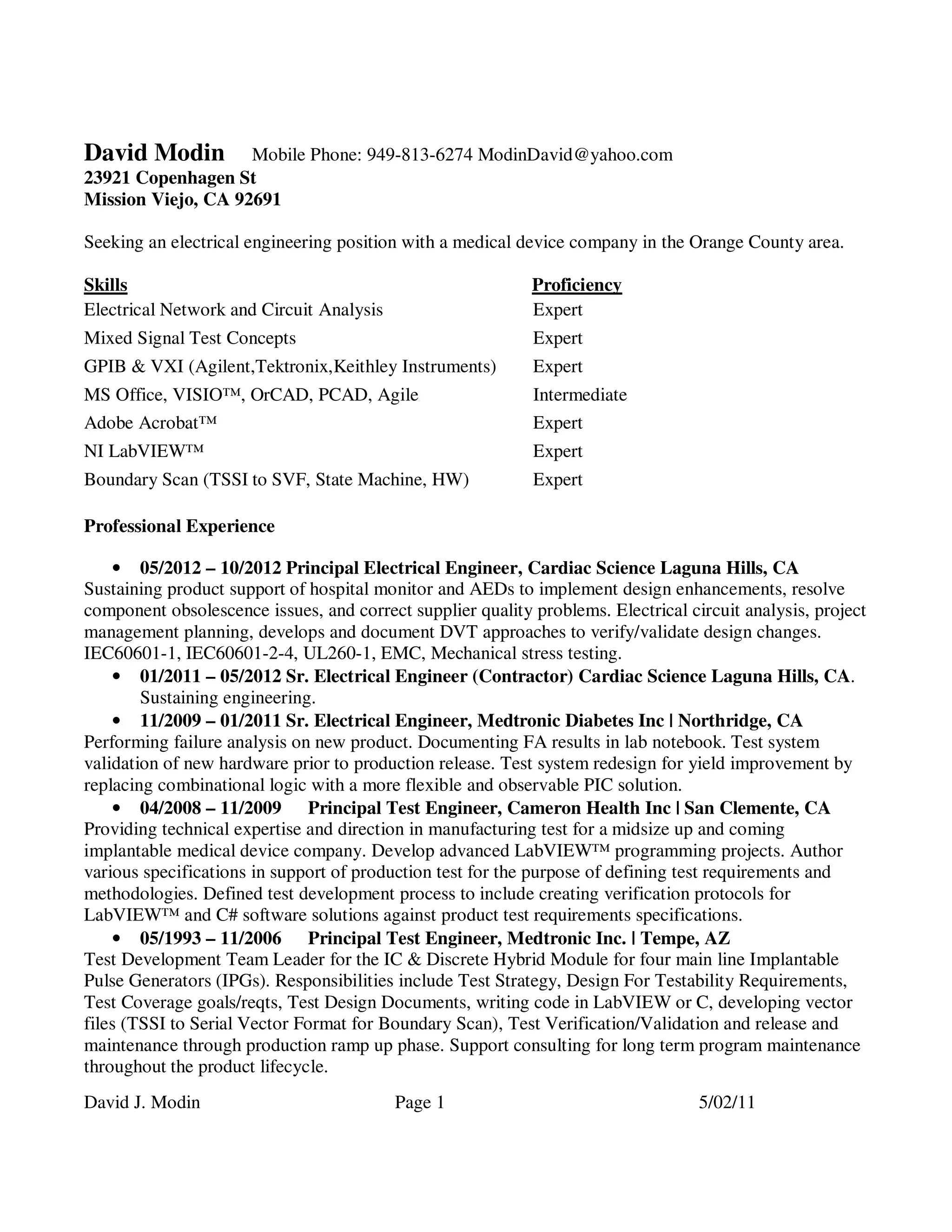 David Modin is seeking an electrical engineering position in Orange County and has over 20 years of experience in medical device testing. He has expert proficiency in electrical network analysis, mixed signal testing, and various engineering software. His professional experience includes positions at Cardiac Science, Medtronic Diabetes, Cameron Health, and Medtronic where he developed automated test systems and improved product yields. He has a Bachelor's degree in electrical engineering from Arizona State University.