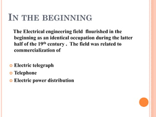 The document provides an overview of the evolution and branches of electrical engineering, from its inception in the 19th century focused on applications like telegraphs and power distribution to modern subfields including electronics and telecommunications. Major historical figures such as Michael Faraday and Nikola Tesla are highlighted for their significant contributions. Additionally, the establishment of standardized electrical measurement units and the importance of engineering developments in communication are emphasized.