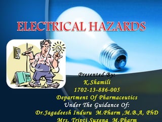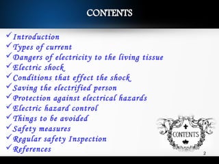 The document discusses electrical hazards and safety. It defines electrical hazards, describes the types of injuries that can result from electric shock like burns and muscle paralysis. It explains how factors like current path through the body, shock duration, and skin resistance impact injury severity. The document provides guidance on helping someone receiving a shock, and safety measures like insulation, grounding, using qualified personnel, and regular inspections to prevent electrical accidents. The key messages are that electricity can be deadly if not used properly, but following safety precautions and procedures can minimize risk.