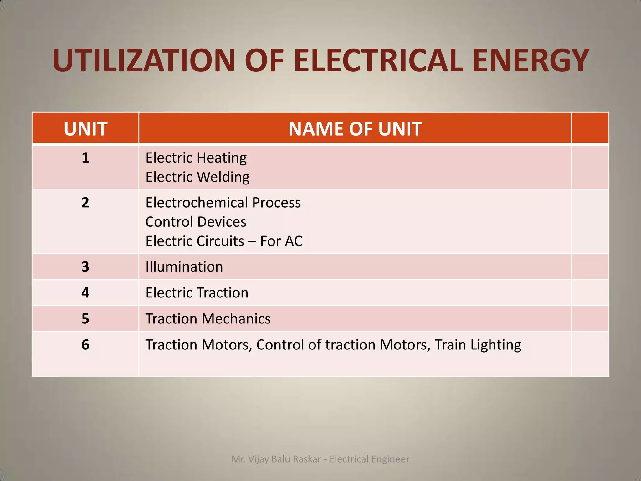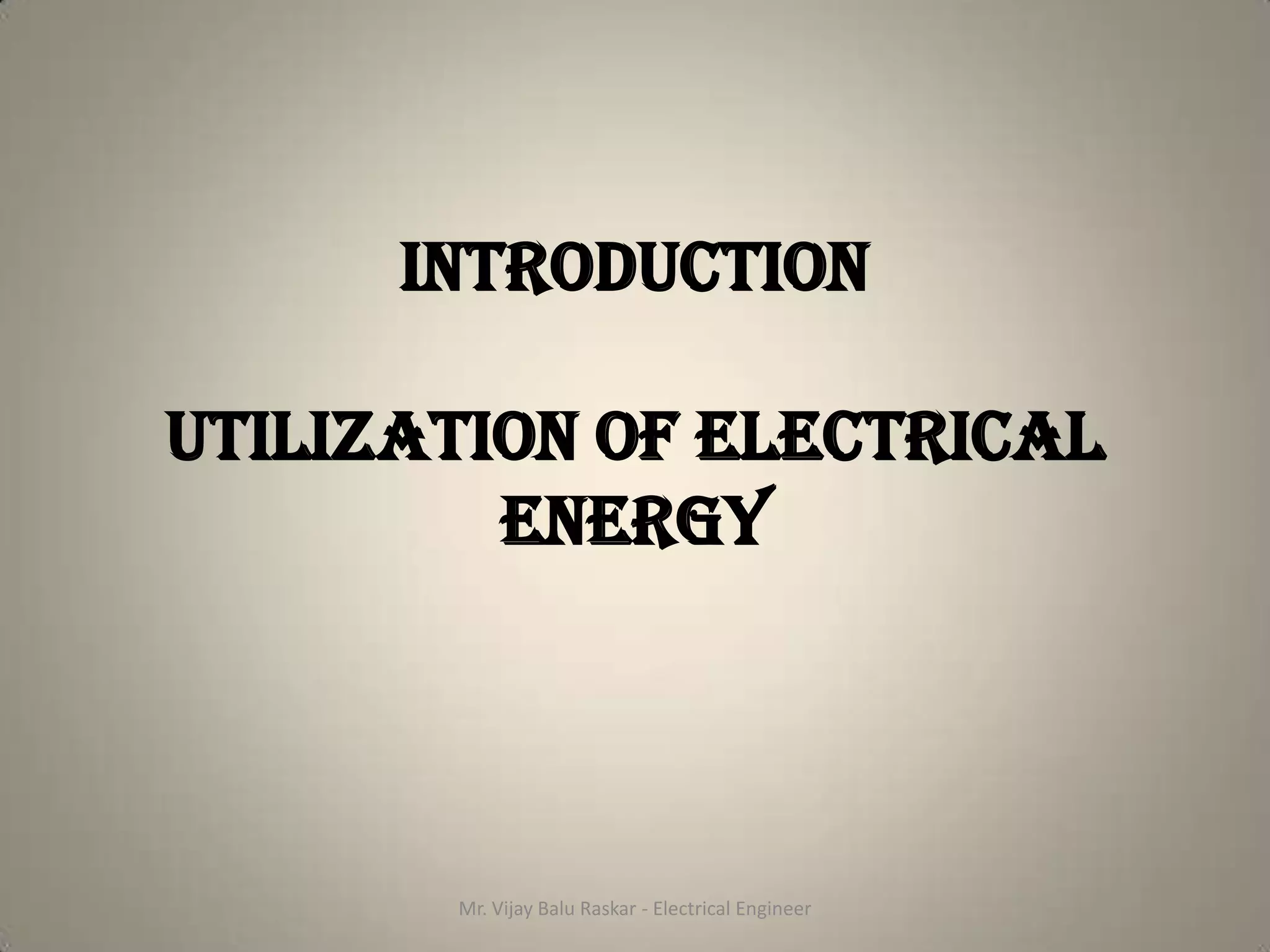 1. The document discusses different methods of utilizing electrical energy, grouping them into 6 units: electric heating, electrochemical processes, control devices, electric circuits, illumination, and electric traction.