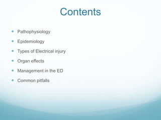 This document provides an overview of electrical injuries, including pathophysiology, types, organ effects, management in the emergency department, and common pitfalls. It discusses how the extent of tissue damage from electrical injuries depends on voltage, current, resistance, and duration of contact. Management involves treating for potential cardiac, respiratory, neurological, musculoskeletal and dermatological effects. High voltage or low voltage injuries with concerning findings require admission. Delays effects like cataracts or bleeding can occasionally occur.