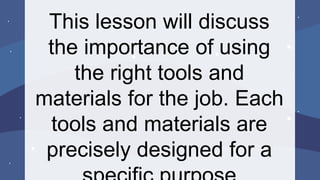 The document discusses the importance of using the right electrical tools and materials for installation and maintenance tasks, emphasizing their specific functions and uses. It outlines learning objectives and details various commonly used electrical supplies, such as wires, convenience outlets, and protective devices, along with common tools like screwdrivers and hammers. Overall, it highlights that using the correct tools and materials enhances efficiency and safety when working with electricity.