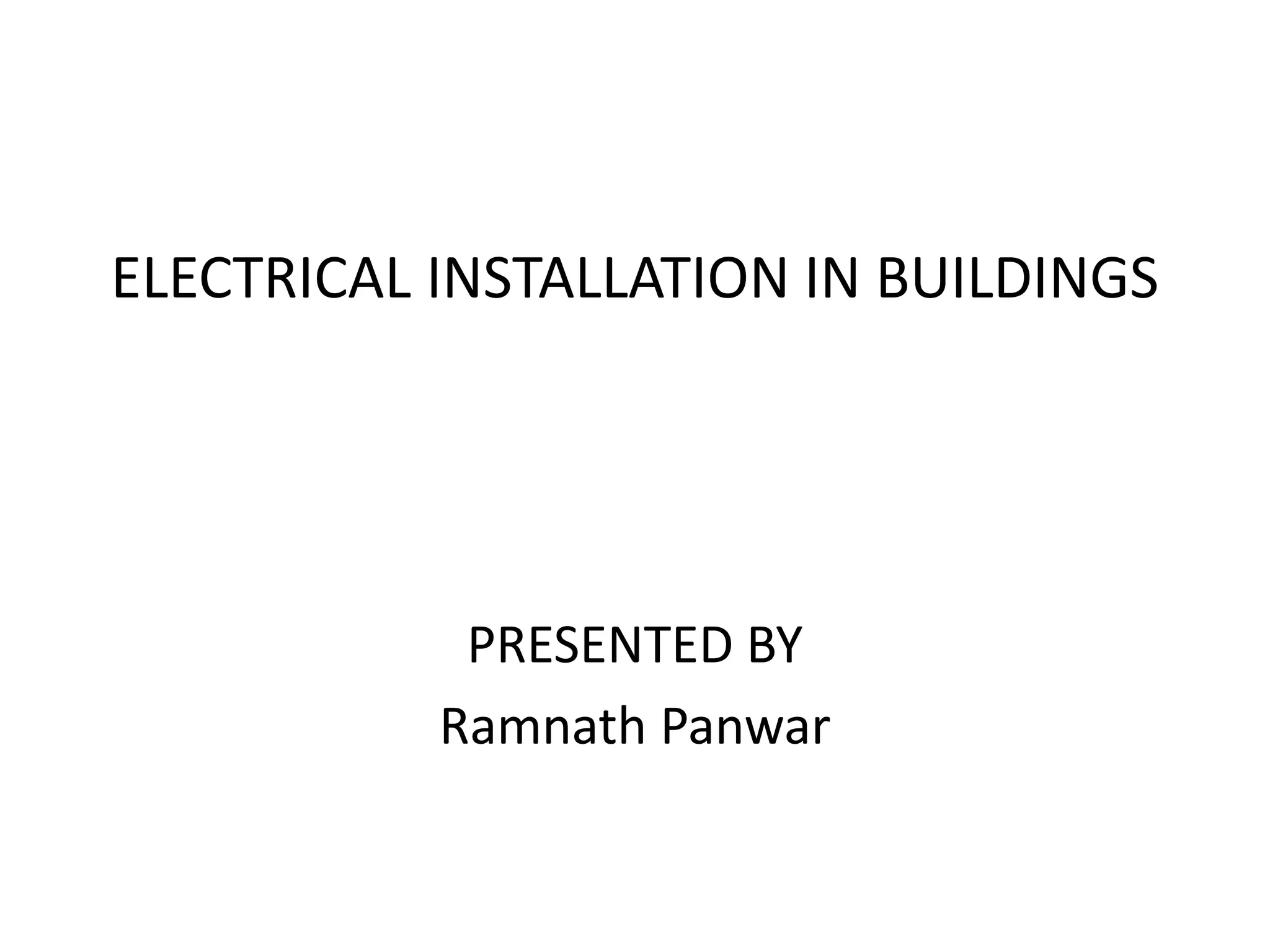 Electrical wiring is the process of connecting cables and wires from various devices like lights, fans, switches, and sockets to the main distribution board for continuous power supply. There are different types of electrical wiring systems including cleat wiring, wooden casing and capping wiring, CTS or TRS or PVC sheath wiring, lead sheathed or metal sheathed wiring, and conduit wiring. Conduit wiring can be surface or open conduit wiring or concealed or underground conduit wiring depending on where steel or PVC pipes are used to run the wires. Buildings come in different types including residential for personal houses, industrial for companies, and workshops for product manufacturing.