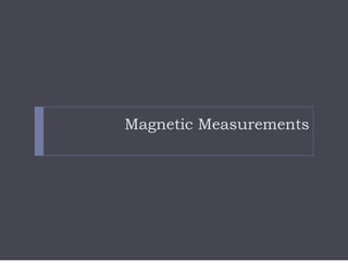 The document discusses various methods used for magnetic measurements. It describes the ballistic galvanometer and flux meter, which are used to measure the quantity of electricity passed through a search coil due to a changing magnetic flux. It also summarizes methods to determine the B-H curve and hysteresis loop of ferromagnetic materials, including the method of reversals and step-by-step method. Additionally, it outlines the wattmeter method for measuring core loss in strip materials using an Epstein or square core assembly with magnetizing coils.