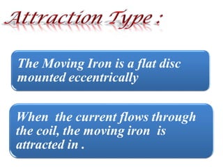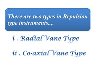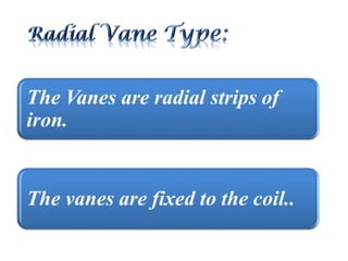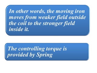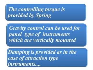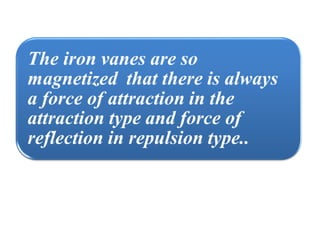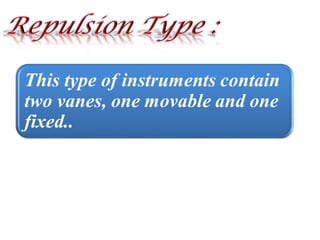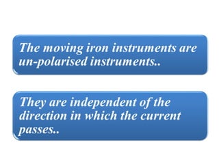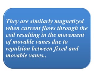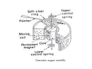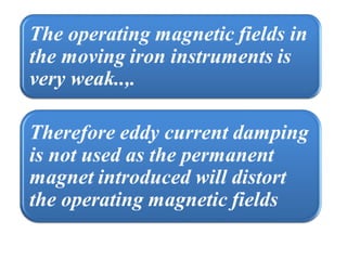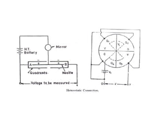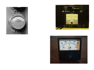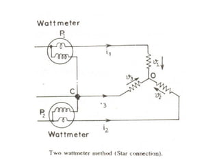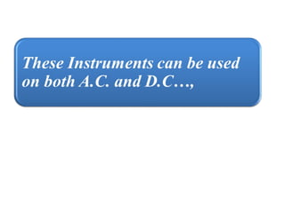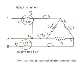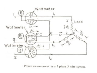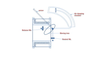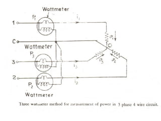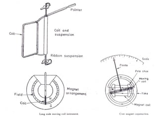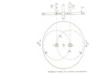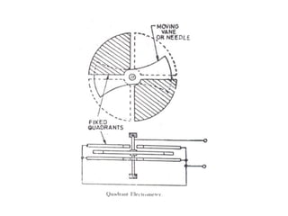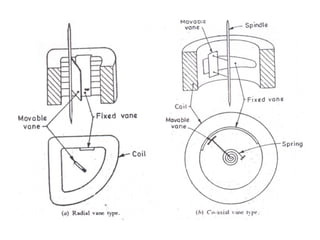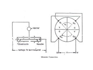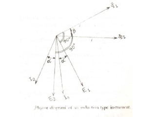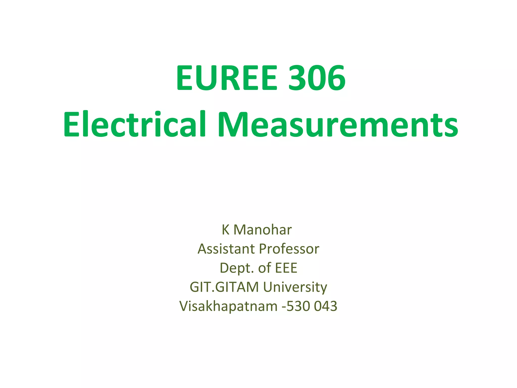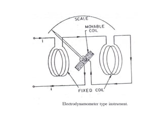 This document discusses electrical measurements and various types of measuring instruments. It covers topics like indicating instruments, wattmeters, energy meters, bridges, potentiometers and instrument transformers. Specifically, it describes the principles and components of instruments like permanent magnet moving coil meters, moving iron meters, dynamometer wattmeters and single phase induction energy meters. It also discusses bridges like Wheatstone bridge and potentiometers for electrical measurements. Measurement of parameters like frequency, power factor using different types of meters is presented.