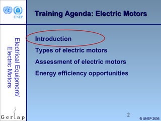 This document provides an overview of electric motors and opportunities for improving their energy efficiency. It begins with an introduction to electric motors, including their basic function and common types such as DC motors, synchronous AC motors, and induction AC motors. It then discusses assessing motor load and efficiency, highlighting factors that influence efficiency like age, load level, and temperature. The document concludes by outlining several energy efficiency opportunities for electric motors, such as using high-efficiency motors, reducing underloading, improving power quality, proper sizing for variable loads, and regular maintenance.