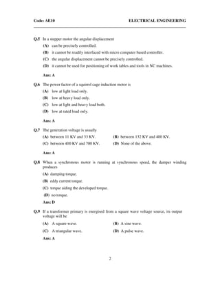 The document contains 40 multiple choice questions and answers related to electrical engineering topics. Some key topics covered include: