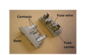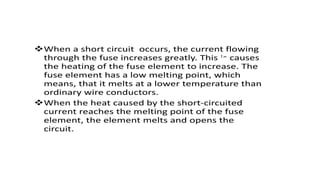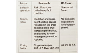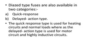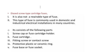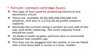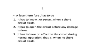 The document discusses protection devices in electric circuits, emphasizing their necessity to prevent damage from excess current. It specifically explains the characteristics of fuses, including fusing current, current rating, cut-off factor, and the materials used. Additionally, it categorizes cartridge fuses based on their rupturing capacity.