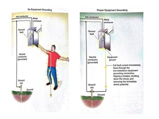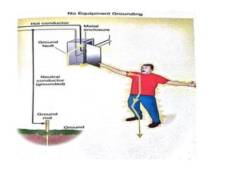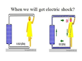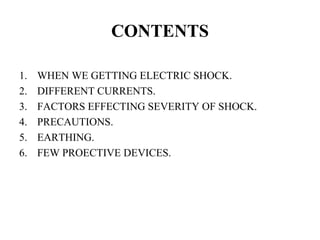 The document outlines the dangers of electrical shocks, detailing the various types of currents and factors affecting shock severity. It emphasizes safety precautions and first aid measures for electric shocks and provides guidelines for preventing electrical hazards in homes. Additionally, it discusses grounding, protective devices such as fuses and circuit breakers, and the functionality of multimeters for electrical measurements.