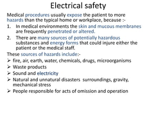 This document discusses electrical safety in medical environments. It outlines several hazards posed by electricity in these settings, including fire, hazardous substances, waste products, sound, electricity, and disasters. It then examines the physiological effects of electric current on the human body, such as stimulation of nerves and muscles, heating of tissues, and electrochemical burns. Threshold currents for perception, involuntary muscle contractions, respiratory paralysis and ventricular fibrillation are provided. The document also discusses electric power distribution, isolation systems, emergency power systems, electric faults in equipment, microshocks, and conductive paths to the heart in clinical devices.