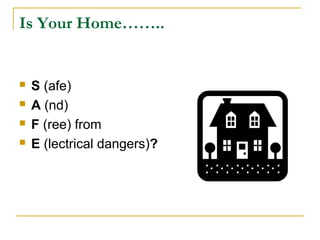 This document provides information and safety tips regarding electrical safety both indoors and outdoors. It advises checking electrical cords and outlets for wear, keeping appliances away from water, using power strips safely, and unplugging appliances after use. It also outlines safety procedures for electrical fires, shocks, downed power lines, and lightning, and recommends building an emergency kit for power outages. The overall message is to be aware of potential electrical hazards and follow precautions to prevent electrical injuries or fires.