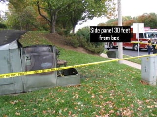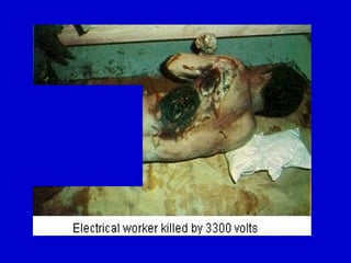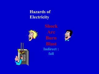 The document outlines electrical safety hazards, including shock severity, causes of electrical accidents, and the importance of grounding and safe work practices. It details the dangers associated with electrical currents, risks of falls from shocks, and the necessity of using protective equipment. Recommendations for preventing electrical hazards include using barriers, properly tagging circuits, and maintaining equipment.