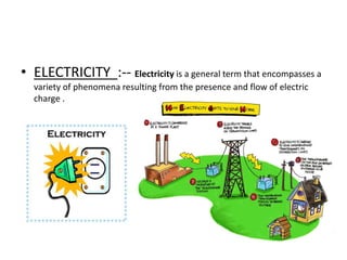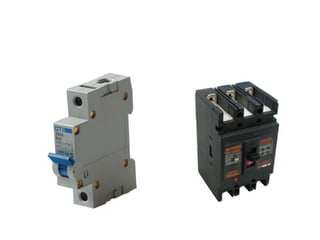 This document summarizes different types of electrical distribution and protection equipment, including fuses, fuse holders, circuit breakers, wires, switches, and wiring methods. Fuses contain a fusible element that melts when too much current flows, interrupting the circuit. Circuit breakers can be manually or automatically reset after tripping. Common wiring methods include cleat wiring, batten wiring, casing capping, and conduit wiring, which fully encloses wires.