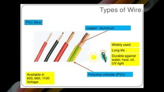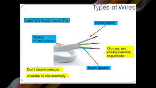 This document provides definitions and information about various electrical concepts and components. It defines electrical services and discusses their uses in residential, industrial, and commercial buildings. It also defines key electrical terms like current, potential difference, conductors, insulators, and discusses direct and alternating current. The document then covers domestic electric supply systems, wiring components like fuses and circuit breakers, and different types of earthing systems. It concludes by describing various wiring methods and types of wires.