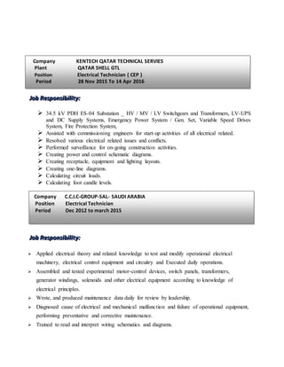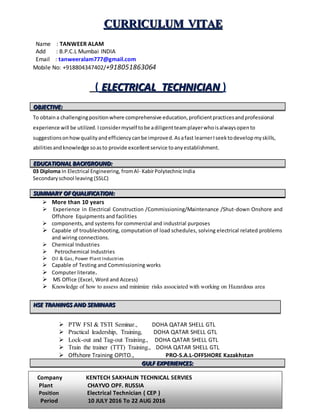 This document provides a curriculum vitae for Tanweer Alam, an electrical technician with over 10 years of experience in electrical construction, commissioning, maintenance, and shutdown work for onshore and offshore equipment and facilities. It includes details on his educational background, qualifications, training, work experience with various companies in India, Saudi Arabia, Qatar, Russia, and Kazakhstan, as well as personal details.