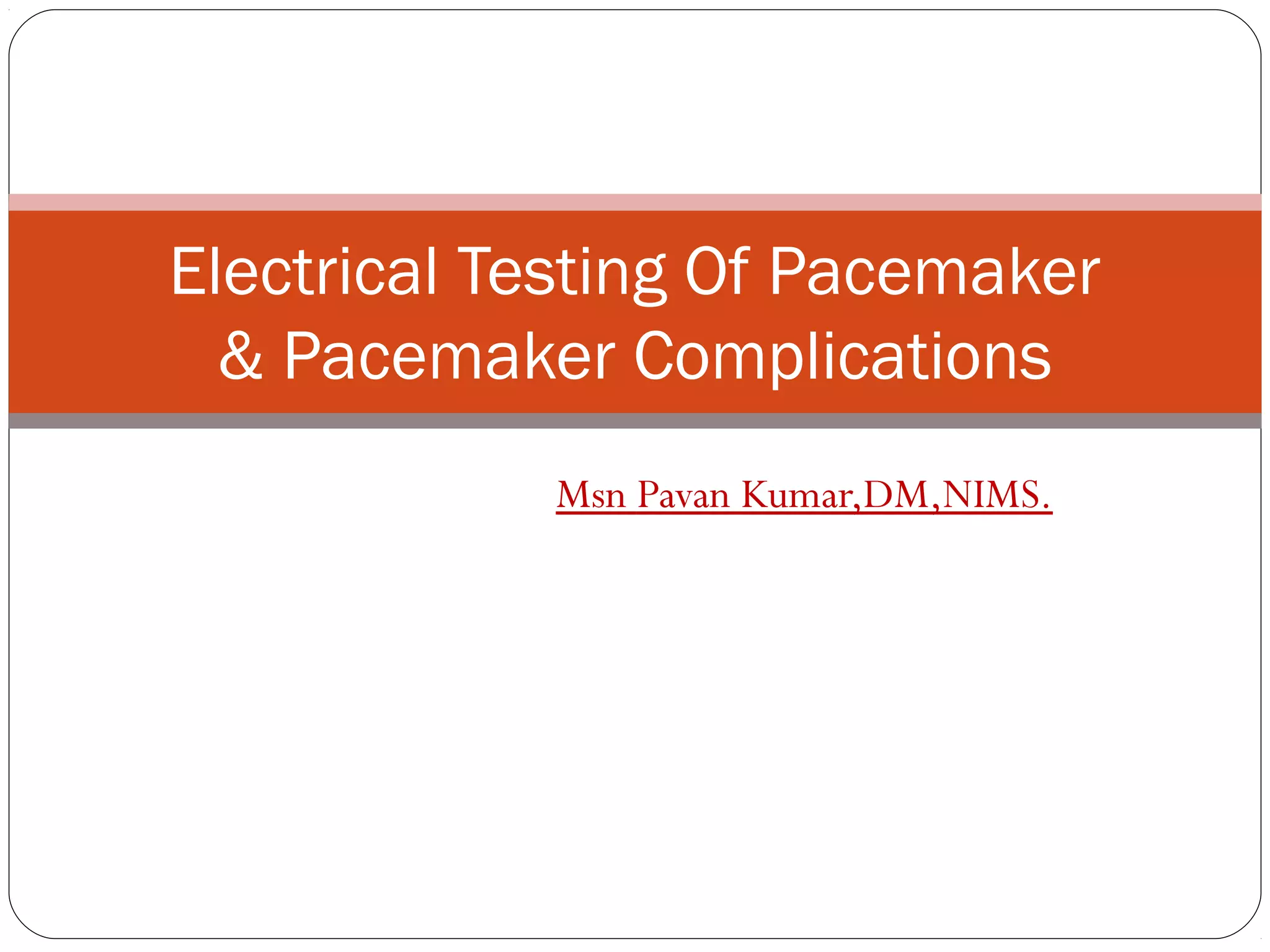 This document discusses electrical testing of pacemakers and pacemaker complications. It describes the components of a pacemaker including the battery, pacing impedance, pulse generator, and modes and mode switching. It then discusses testing various aspects of the pulse generator including output circuit, sensing circuit, timing circuit, and rate responsive pacing. Finally, it briefly outlines some common pacemaker complications such as pocket complications, lead issues, infections, and device malfunctions.