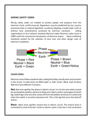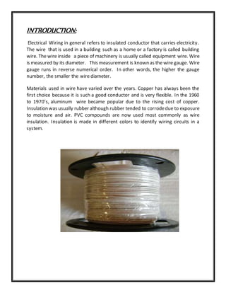 This document provides an overview of electrical wiring, including key terms, materials, safety codes, color codes, wiring methods, and cable types. It discusses how wire is measured and materials that have been used over time, such as copper and aluminum. Wiring safety codes are intended to protect people from electrical hazards. Common color codes for electrical wires include red for phase, black for neutral, and green for grounding. Wiring can be installed using either a joint box system or loop-in system. Different cable types are used for various applications such as building wiring, long-distance communication, and bulk power transmission.