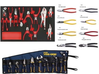 This document provides information about various electrical tools used in electrical work. It describes power meters that can measure voltage, current, power, and perform harmonics analysis. It also discusses clamp meters that measure current in a conductor without contact, line testers to identify live wires, and continuity testers to check circuits. Additionally, it covers nut drivers, manual drills, electric drills like corded drills and cordless drills, hole saws, soldering irons and guns, and various types of pliers, wire strippers, screwdrivers and their uses. It also gives safety tips about maintaining tools properly, using the right PPE, and electrical hazards.