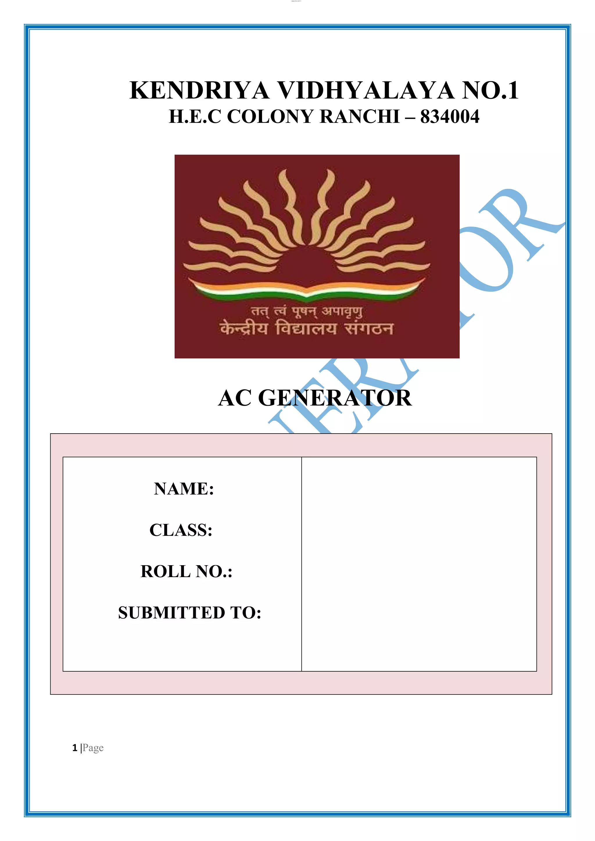This document is a student project report on an AC generator. It includes sections on the theory, working, components, efficiency, results, uses, losses, and precautions of an AC generator. The key components discussed are the field, armature, prime mover, rotor, and stator. It explains that an AC generator converts mechanical energy into electrical energy using electromagnetic induction as the rotor rotates within a magnetic field. Efficiency is calculated as the ratio of output power to input power. Common uses include power generation and appliances. Losses occur from internal resistance, hysteresis in the iron cores, and mechanical factors like bearing friction.