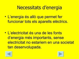 Necessitats d’energia L’energiaés allò que permet fer funcionar tots els aparells elèctrics. L’electricitat és una de les fonts d’energia més importants, sense electricitat no estariem en una societat tan desenvolupada.