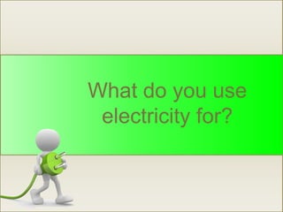 Electricity is a form of energy that is commonly used in everyday devices like heaters, phones, lamps, and fans. It is the flow of electrons through conductors like wires. An electrical circuit requires a power source, conductors to carry the current, and components that use the energy like light bulbs. Circuits can be connected in series or parallel. Voltage, current, and resistance follow Ohm's Law. Common circuit elements include batteries, wires, switches, and fuses. Electricity powers devices by producing effects like light, motion, and heat.