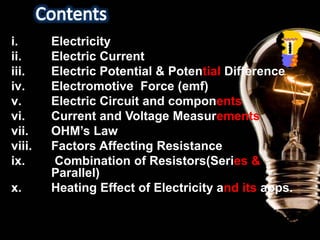 The document provides a comprehensive overview of electricity, including its fundamental concepts such as electric current, potential difference, electromotive force, and resistors. It describes the configuration of electrical circuits, the roles of components like batteries, switches, and fuses, and outlines current and voltage measurements as well as Ohm's Law. Additionally, it addresses practical applications of electricity and the heating effects resulting from electrical resistance.