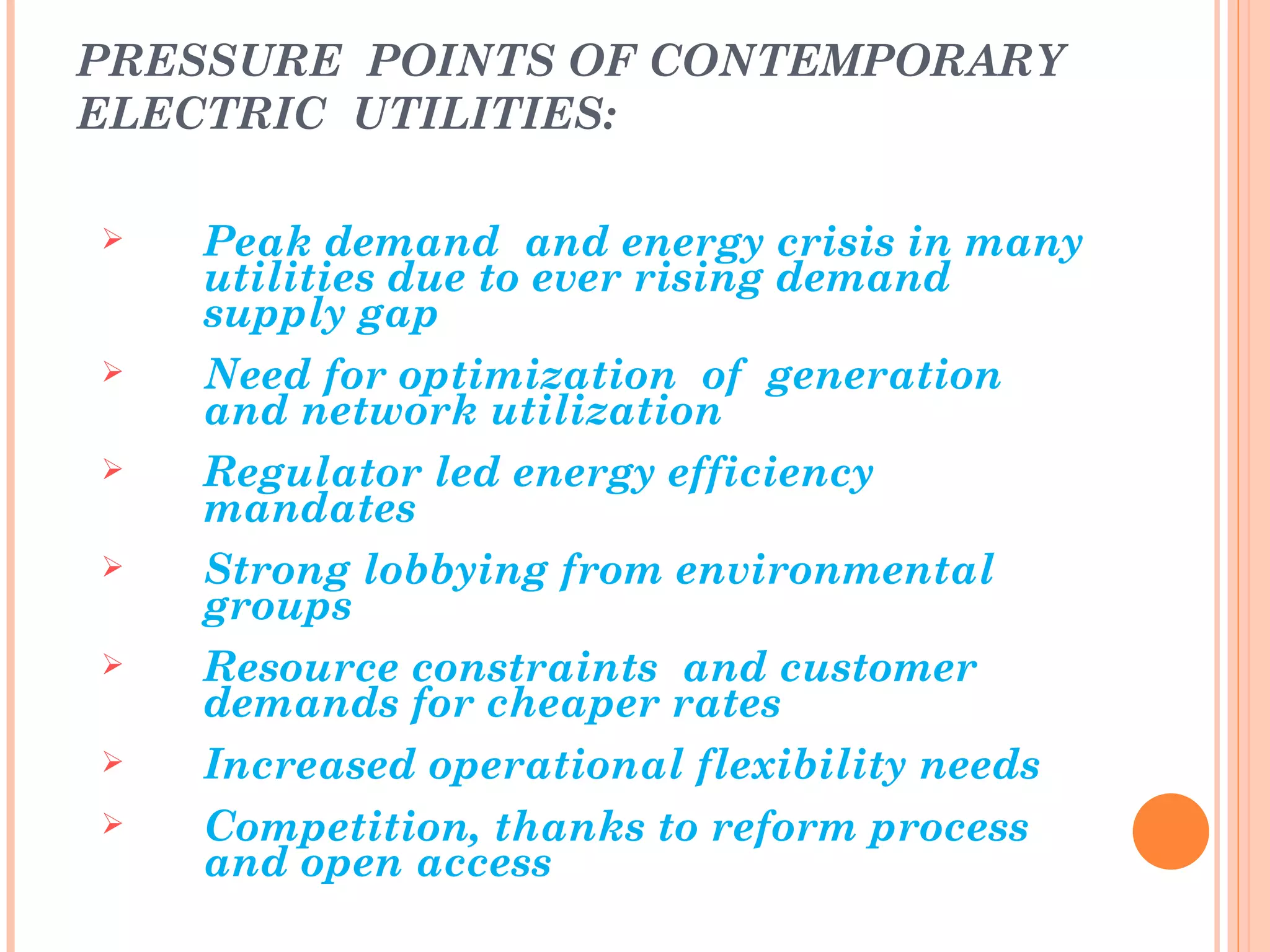 This document discusses electricity demand side management and end use efficiency. It outlines the benefits of demand side management (DSM) programs for electric utilities, including optimizing generation and network utilization and meeting regulator efficiency mandates. It describes traditional utility planning tools like load forecasting and least cost planning, which consider both supply side and demand side alternatives. The document then provides details on DSM, including definitions, frameworks, program implementation methods, technologies and options for the industrial sector. Barriers to DSM programs and ways to enable greater DSM markets are also discussed. In conclusion, the document advocates for customized DSM programs targeting specific end users as a cost-effective alternative to supply side management.