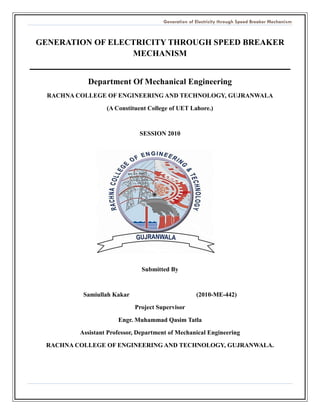 This document describes a project to generate electricity from speed breakers on roads. As vehicles pass over speed breakers, kinetic energy is wasted through heat and friction. This project aims to convert that wasted energy into electrical energy. It proposes installing movable speed breakers connected to a rack and pinion mechanism to convert vertical motion into rotational motion. This rotation would generate electricity using standard generators. The document outlines the working principle, components, advantages, and scope of the project. It aims to provide a sustainable energy source by tapping into kinetic energy from traffic on busy roads.