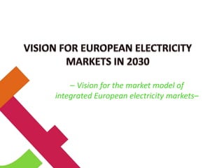 This document presents a vision for integrated European electricity markets in 2030. It discusses the development of electricity markets from national to regional models. As transmission networks expand, markets move from zonal pricing models to increasingly complex nodal pricing models to account for transmission constraints. The document examines existing market models in Europe, including the Nordic countries, Central West Europe, PJM, Texas, Australia and New Zealand; outlining their key features such as pricing mechanisms, generation sources, and consumption levels. The vision is for an efficient European market that ensures secure, affordable and sustainable electricity supply.